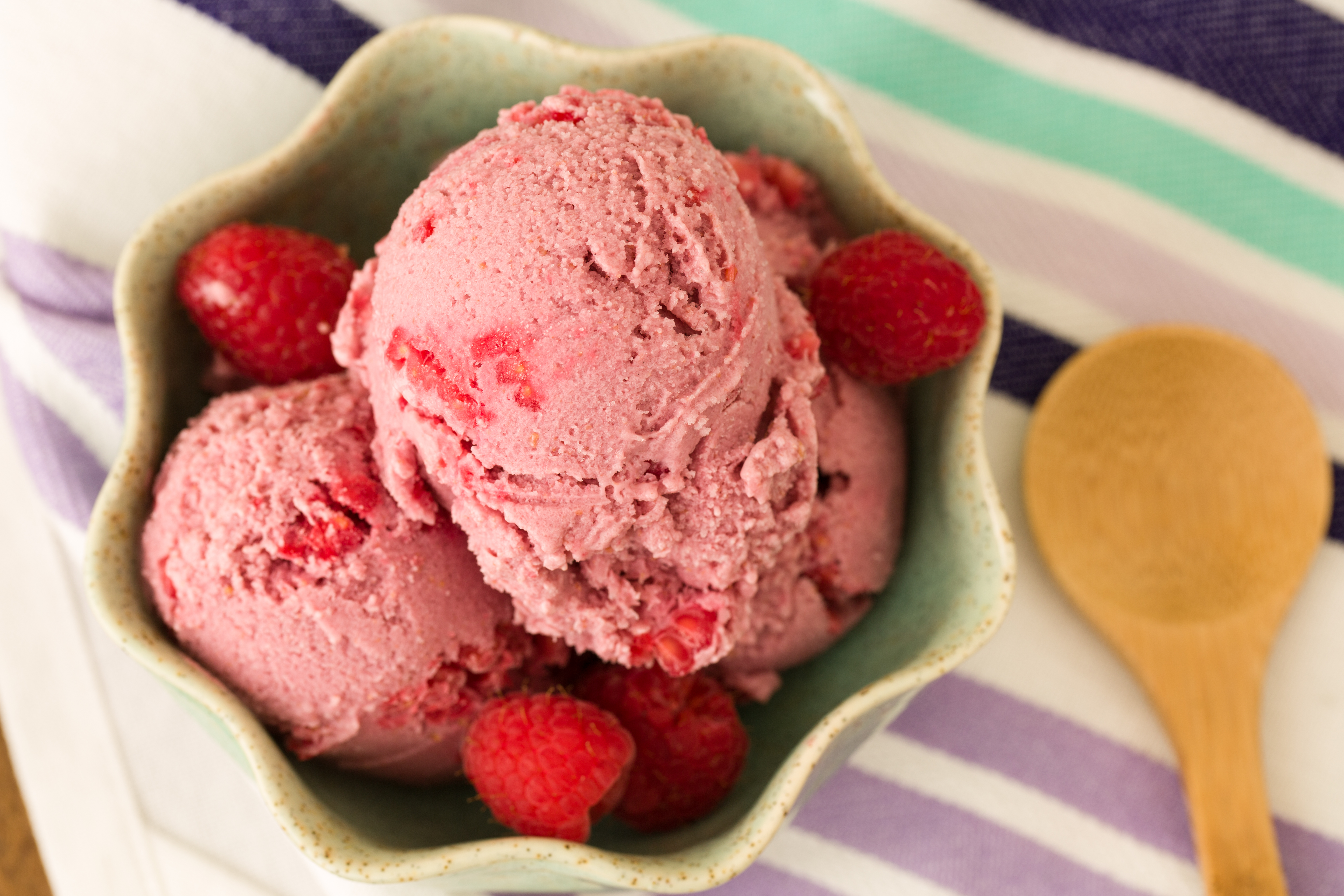 Place coconut water, coconut meat, cashews, honey, Perfect Fit, vanilla and salt in a blender. Blend until smooth. Add 2 cups of raspberries to blender and mix thoroughly. Keep blender going and add soy lecithin. Blend until creamy. Then add the additional raspberries into mix. Stir gently to keep the raspberries whole. Pour into container and place in freezer for at least 12 hours to harden