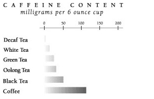 Caffeine occurs naturally in tea, although in smaller proportions than in coffee, chocolate or cola drinks. A mild stimulant, it accounts for tea’s reputation as a beverage that clears the mind and lifts the spirit. On average, a six-ounce cup of steeped tea has about forty milligrams of caffeine — less than half the amount in a cup of brewed coffee. The greatest concentration of caffeine is found in the bud and first two leaves of the tea bush.Caffeine Content